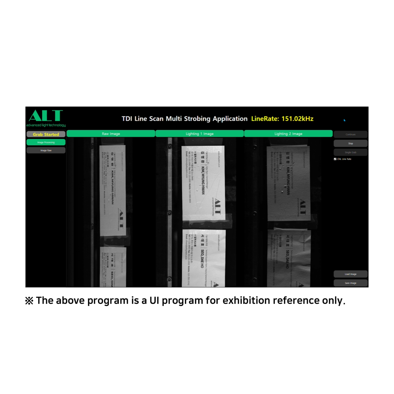 The TDI Line Scan Multi Strobing Application dedicated UI program allows users to view the results of three displayed images, which are described as follows: